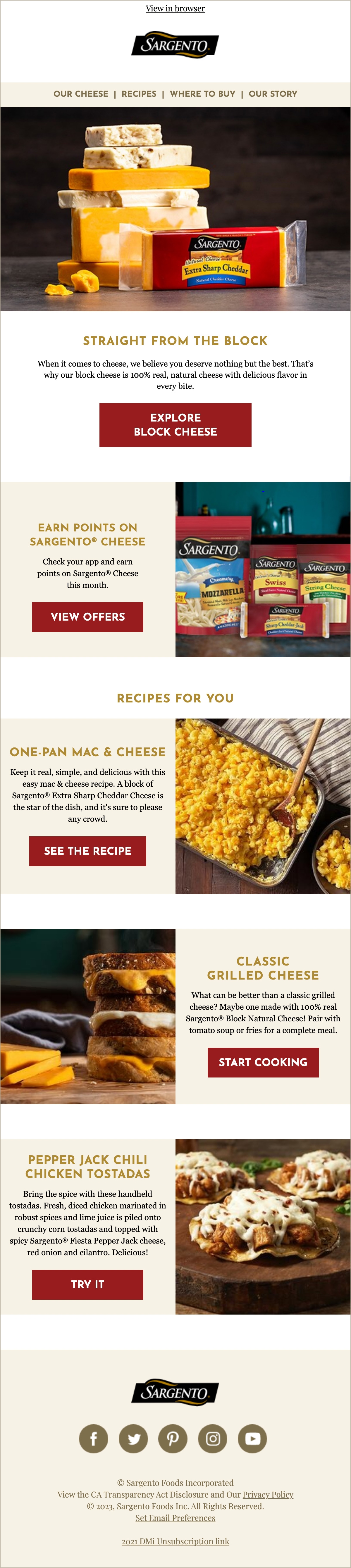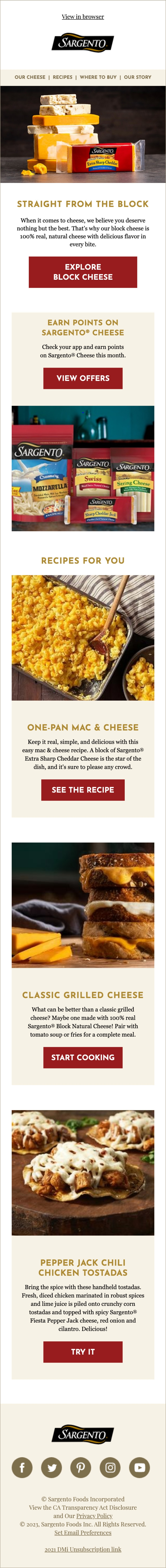 Last fall, we welcomed a new wave of subscribers into the Sargento family that indicated an affinity to Sargento® products through their interactions with a leading loyalty rewards program. This affinity enabled Sargento to deliver relevant content and personalized rewards to lovers of Sargento’s real cheese. With this new wave, we were able to acquire more data about our subscribers’ preferences and purchase histories, which sparked the idea to build personalized content into our welcome series and the ongoing monthly sends for this audience.